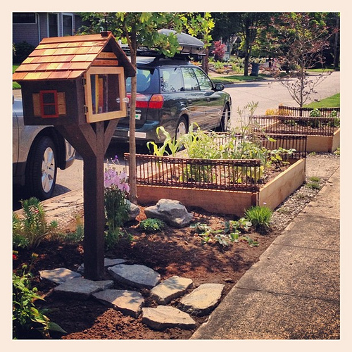 We've been doing some major work on our front yard - putting in veggie garden beds, new sod, rocks, and more. Adding in the library was the last little project for the yard and we LOVE it. Can't tell you how many curious neighbors have stopped by. I'm hoping others will join us!