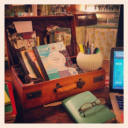 Kelly Rae: When I was setting up my office in a closet a couple of years ago, my mom suggested I use a suitcase to hold office supplies. A suitcase? I never got around to it, but I finally took her up on the suggestion when I moved into my new office.