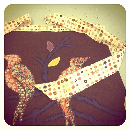 Mom: I simply cut out the front panel of the skirt, hemmed the sides with a very small hem, added a coordinating fabric for waistband and ties. For the waist band I used about 8” of fabric folded in half with a 1” hem. I used the width of my fabric for easy sake (about 42”), I then added the same fabric to each side for the tie. It was so exciting to see the finished product. I think it’s cute enough to wear over jeans even.