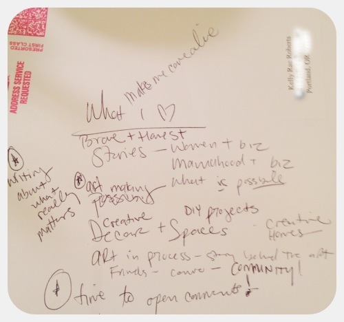 It's not super detailed, but I knew writing the basics down would help me re-focus on what's calling my attention and help me figure out what's not working. Because here's the truth: if our lists of what makes us come alive are not aligned with what we're actually doing (in biz or in life), then something has to be adjusted and realigned. This little scribbled list is totally helping me get realigned, especially when it comes to my blog. I am working on completely overhauling my blog's content, structure, and offerings. My goal? To incorporate as much as I can from the list above into meaningful blog posts. I want to get back to basics and simply do what I love to do: make art, have fun with creative projects/spaces, and write honest stories about life, the lessons, the journey. I want all of that to show up here, in this space. I want to create content that is inspiring, tells the truth, shares the bravery of others, while building and supporting a sense of community.