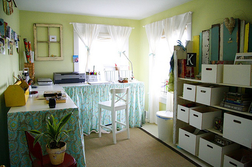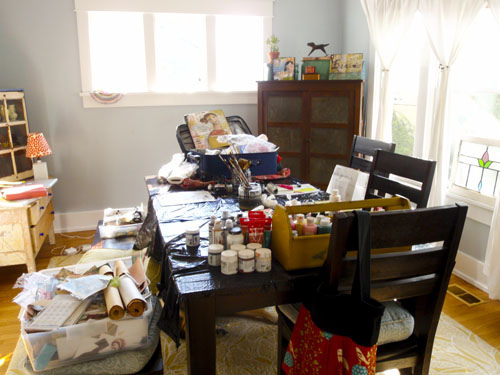 Since starting this creative biz, I've always worked from home. Except for a brief stint when I shared a studio with a friend in CA, my studio has always been either in a spare bedroom, the basement, or even on the dining room table (as you will see in these photos!). My office area, if not in the same room with all the paints, has always been on my lap (with my laptop), at a cafe with wifi, or in a closet.