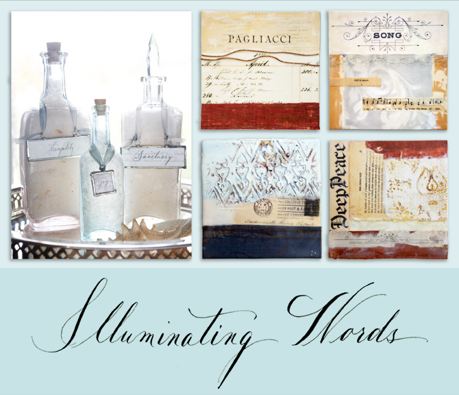 In my pieces, I combine my own lettering and painting with various ephemera, including snippets from old books and dusty hymnals, treasured correspondence from earlier centuries, pieces of vintage sheet music or wallpaper, and character-filled faces from old photographs. Recently, I am particularly focused on the luminous qualities that the encaustic medium brings to the surface as these elements are layered and fused together.