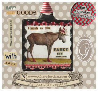 The Clare Jordan product line is filled with happy fun gifts that will bring a smile and many giggles. I have greeting cards, pins, magnets, mirrors, curiosities, beautiful wall plaques, mirrors, paperweights and much more.The artwork is both sentimental and quirky so the overall effect is one of whimsy, nostalgia and humour. All of the products are beautifully created using very high quality materials: I use German glass glitter and French Ribbon to decorate.