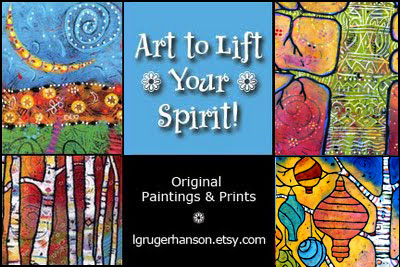 [image error] Greetings, My name is Lindy Gruger Hanson and I'm a peace loving and joyful hearted artist living in the high desert of Central Oregon. My paintings are a way to express my inner vision in what I call my symbolic language. I love color. I love texture. I like to take shapes, lines, textures and colors to create a world from the imagination. Worlds of playfulness and energy connecting each of us to each other. I hope my art can lift your spirit! I have colorful prints for sale in my Etsy Shop and I invite you to see my original paintings for sale on my website. For all Kelly Rae readers, please use discount code kellyrae2011 to receive a 10% discount in my Etsy Shop, good through Nov. 31st. And I hope you'll come by my blog and say hi.