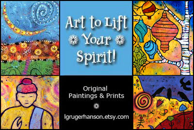 Greetings, my name is Lindy Gruger Hanson and I'm a peace loving and joyful hearted artist living in the high desert of Central Oregon. I'm sweet on nature, birds, travel, shining the light and making acrylic paintings! I hope my art can lift your spirit. My aim is to create art that can inspire people, make a house a home, and bring joy and positive energy into the world. I love creating colorful, whimsical prints and cards for sale in my Etsy Shop and I invite you to come see my original paintings located on my website. For all Kelly Rae readers, please use discount code kellyrae2011 to receive a 10% discount with purchase in my Etsy Shop. Good through Oct. 31st. And I hope you'll come by my blog and say hi.