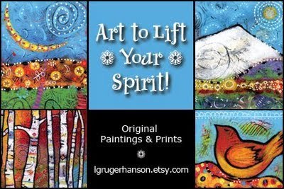 Hi, my name is Lindy Gruger Hanson and I work out of my home studio in Bend, Oregon which I call "Color Spirit Studio". I create colorful, whimsical paintings with the hope that my art can lift your spirit! Vivid color is always one of the most important elements in my work; this is followed by the liberal use of flowing, swirling line-work and textural pattern and shapes, giving each painting its own unique energy and movement. My aim is to create paintings with the belief that art can inspire people, make a house a home, and bring joy and positive energy into the world. There are colorful prints and greeting cards in my Etsy Shop and original paintings on my website. For all Kelly Rae blog readers, you can receive a 10% discount with purchase in my Etsy Shop when you use the discount code kellyrae2011. Good through May 1st. I hope you'll come by and check it out!******************************************