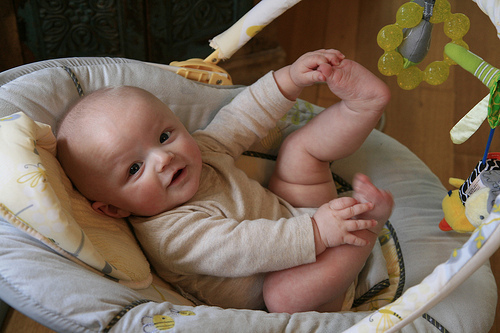 (True turned 5 mos on 3/3 and he's loving his toes and feet, rolling over, laughing, and teething [ugh]).