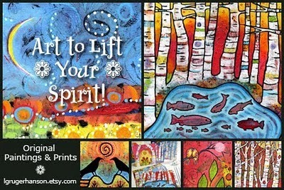 Artist Lindy Gruger Hanson can look out on tall pine and aspen from her Central Oregon studio and she uses her sense of the natural world to depict an inner, symbolic journey in her paintings. Stylized images of rivers, trees, birds and symbolic shapes seem to glow with a warm halo of energy. She says, "My aim is to create paintings with the belief that art can inspire people, make a house a home, and bring joy and positive energy into the world!" She hopes that her playful, vividly colored paintings can lift the spirit of others. Prints and greeting cards can be found at her Etsy Shop and original paintings on her website.