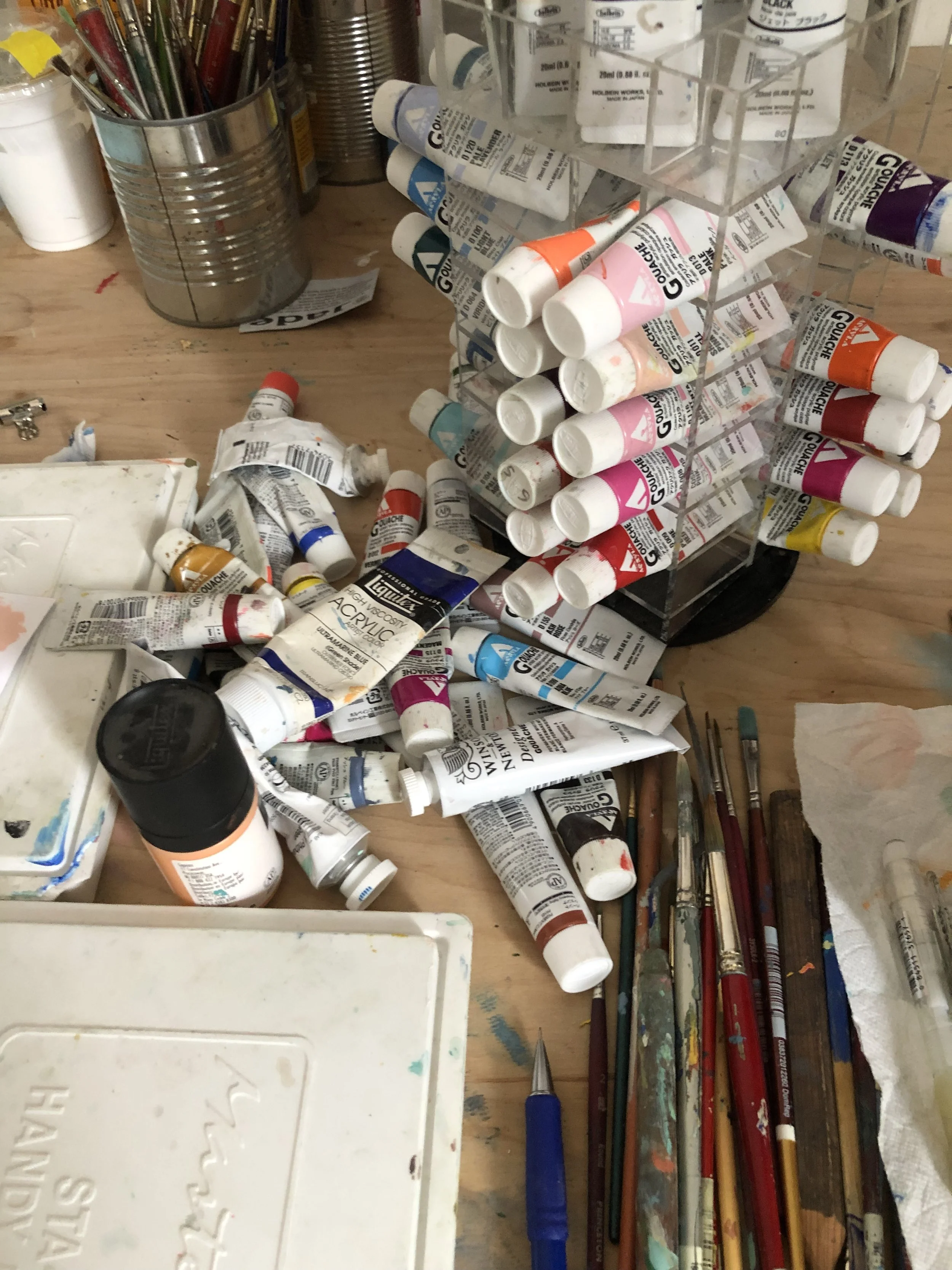 Where an exhibition did not have studios recreated, there were always cases filled with the artist's tools, toys, and objects from their life. One example was from Tove Jansson's exhibition I saw in Osaka, The Art and The Story. Here, you can see the photo of the artist in her studio and in the cases, some of her tools. (Read the whole article about the exhibition here by Benjamin Clark.) OMG this show was inspiring and so is her workspace. (Her space had a little attic passage where her and her love Tuulikki could connect for dinner. I die.)