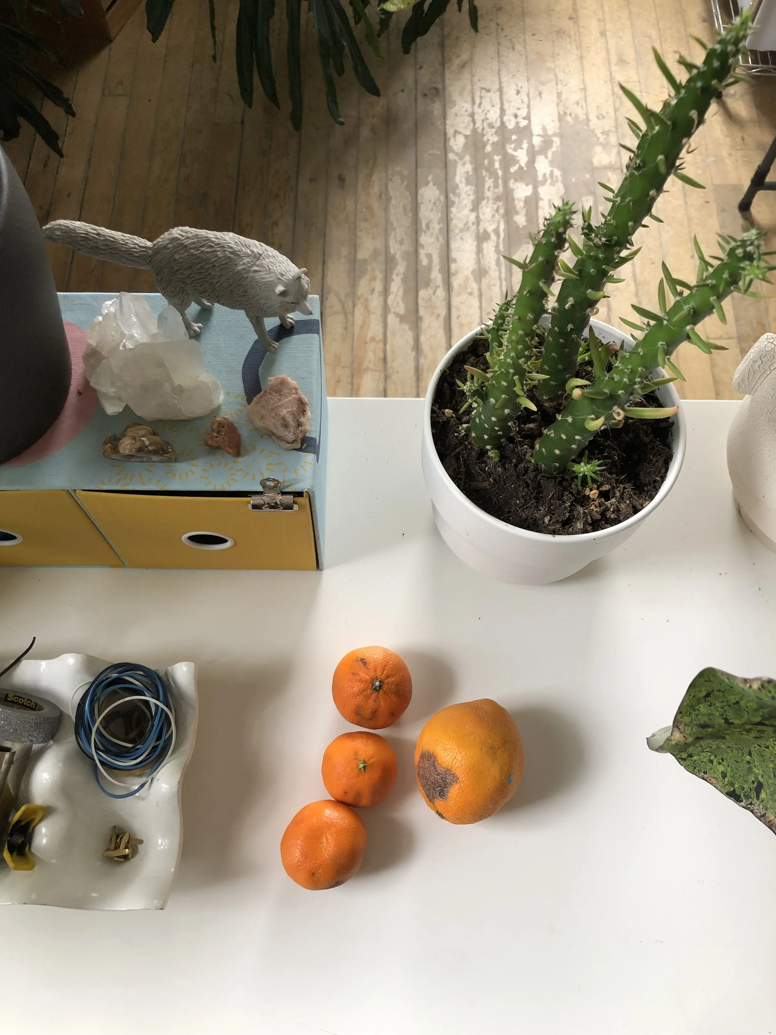 I've worked in many different locations: a college cubicle space, an old warehouse with broken windows and no heat above an antique store, a fine art studio called The Lodge, in the half bedroom in our Denver apartment, a shared office in an a converted laundromat, a short stint at the old Fort Houston co-working space in Nashville where I rented a table in the wood shop and my work was covered in dust…and then I opened the Warren with Kayla Stark in the Shoppes on Fatherland. That coworking space held anywhere from 5-10 artists and was a dream. After that, I worked in the corner of my dining room/living room in Osaka where I made a standing desk out of a coffee table. Coming back to MI, I had a temporary studio in the dining room/living room/kitchen in our apartment before finally setting up my dedicated studio in our new home. I feel spoiled setting up a space that is all mine!
