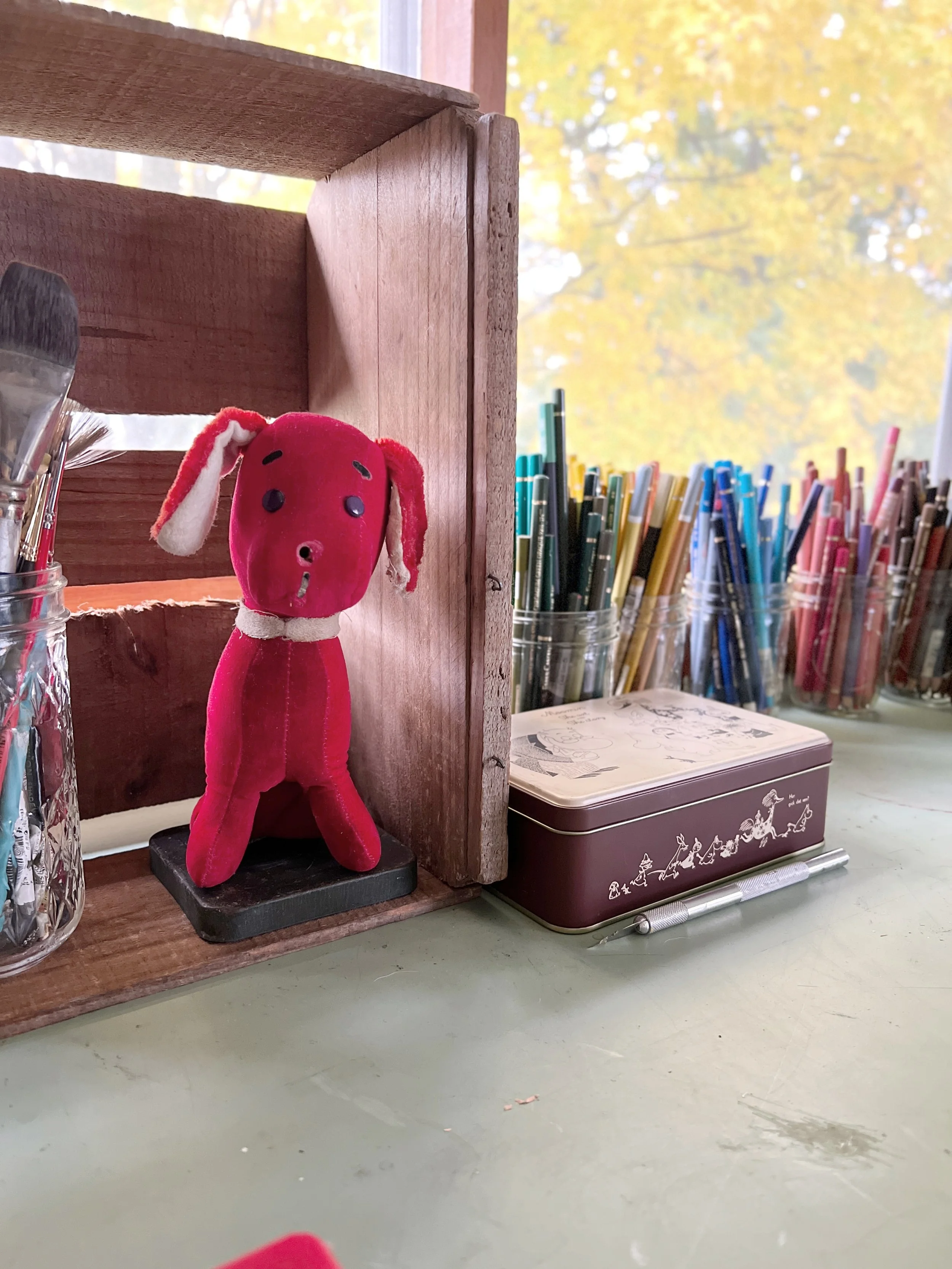 It is in the Historic River market area in Kansas City. Basically if you kept going past our studio building you’d end up in the Missouri River. It’s cold, windy and very industrial but we love it. I share the sunny space with Tammy Smith, a ceramic artist, Rachel Allen, a designer and watercolor painter, and Tina Niedlein, a writer. Between us there are 5 dogs coming in and out of the studio at all times! For the most part they’re never there at the same time aside from my dog Lucy and Tammy’s dog Bubba. They’re bff’s. Then there’s Tina’s dogs, Jimmy and Junie and Rachel’s dog Jasper. And that’s just in our studio. There a ton of other talented folks in the building as well. A print maker, a photographer, another illustrator, a stage prop designer and an interior designer. An incredible furniture designer named Matt Castilleja leases the whole building and runs his business on the first floor. He’s our “landlord” but has become our good friend. He’s a gem and makes the most stunning heirloom furniture for people all over the country.