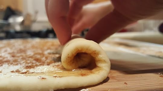 I use Batali’s recipe that he’s linked to, which I’ve made before, and I’m already hesitant. Pizza dough is chewy and crispy, not tender – the latter is what you’d hope cinnamon rolls would be. It’s a savory recipe – incorporating white wine and a generous amount of salt – and I feel like he’s shoe-horning it into a dessert where it doesn’t belong. He’s cutting corners because he gets to cut corners.