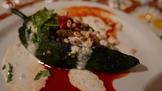 I failed to take a photo of either red or green chile because I ate it too quickly, apparently. But here is a photo of a chile, stuffed with meat and pine nuts. The food was lovely, and is so hyper-regional that you rarely find New Mexican cuisine outside of the state.