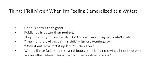 But I suspect all writers feel that way. We are mired in self-doubt and neuroses. Even when we create something that a teeny part of us may actually think is good we still sort of hate it. And then we think of how ungrateful and useless we are because just the fact that we have running water, much less the opportunity to write, is a gift. That push-pull of self-loathing and doubt and gratitude is what makes us writers.