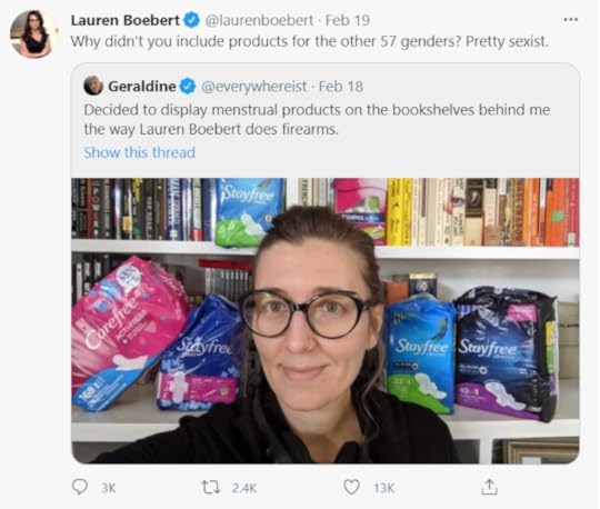 Decided to display menstrual products on the bookshelves behind me the way Lauren Boebert does firearms. pic.twitter.com/GGfai6gdqL