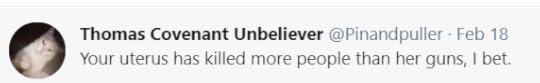 Generally if I tweet anything vaguely critical of the free-for-all smorgasboard that is American’s gun control laws, or anything that acknowledges the horrifying truth that menstruation happens for some humans, my mentions become a shitstorm for a few days. But this, dear friends, managed to hit the sweet spot in the Venn diagram where those two concepts overlap, and so I was hit with a monsoon of crap.