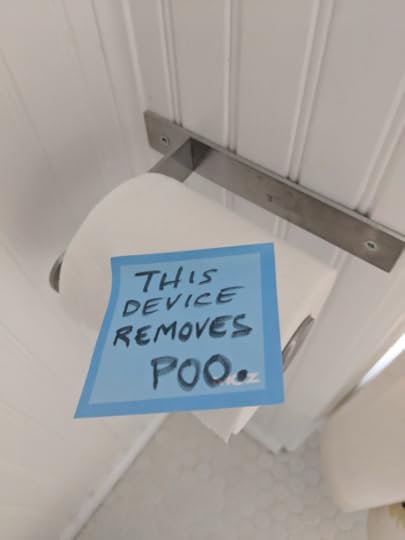 That leaves us with Person 2. Presumably, they entered the bathroom after Person 1, and saw the poo on the seat. Rather than do anything about it, or gently call for the person who had occupied the bathroom before them, or bring it to my or Rand’s attention, or flee from the house weeping (all acceptable behaviors that I would have considered in their position), they instead lifted the seat, peed, and went on their merry way.