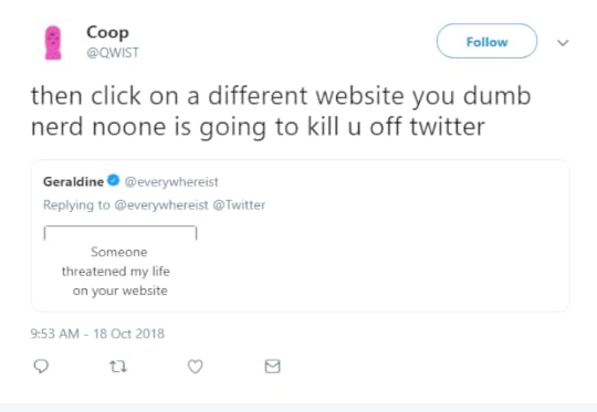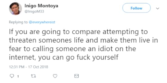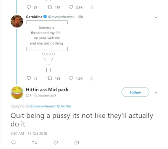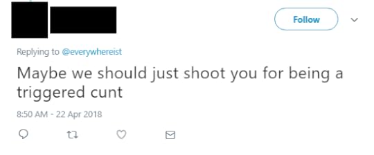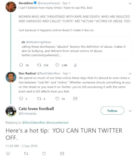 We are told that the threats we receive are nothing to be concerned about – that they remain online, as though somehow there’s a line of demarcation between the internet and the rest of the world. (Spoiler: there isn’t. We do everything online. We buy plane tickets and clothing and groceries, we do work, we interact with friends and family, we watch TV shows and movies, we pay our bills and our taxes. The internet is real life. Those who pretend otherwise are simply trying to separate themselves from the consequences of their actions). That the horrible things that people say to us on the internet can never hurt us in real life.