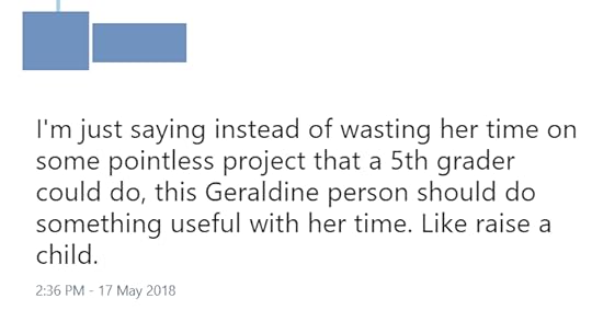 This was about power. I suppose I should have realized from the start that anyone who appears in your Twitter mentions to tell you that you’re fat, ugly, old and barren (“Who among us is NOT?” is my unanswerable reply) isn’t trying to have a conversation. They are simply trying to chase you off the platform, so your voice won’t be heard anymore. This dynamic became so apparent that I was actually able to predict when they would double-down on their insults, based on when I felt the power dynamic shift. A large number of them, perhaps in some effort to save face and regain a semblance of control, told me how excited they were about the project. Others tried to turn the tables on me, and tried asking me questions (most of them of the same insulting nature – asking who radicalized me to feminism, etc.).