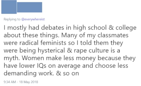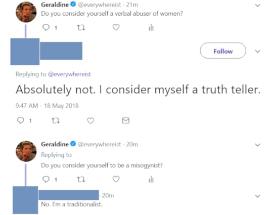 None of these people considered themselves misogynists. I asked them directly, and the responses to this (and to whether or not they considered themselves to be abusers) was a resounding “no.” Many of them made arguments that they treated men and women equally (something that they repeated to me ad nauseum, along with, rather inexplicably, their military service, and the fact that they were fathers). One guy told me that he wasn’t a misogynist or an abuser of women, and literally three minutes later he tweeted this to a woman (in purple below) who called him out: