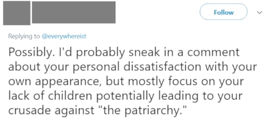 They later doubled-down on the sexist insults. When I asked them about their behavior, almost all of these individuals immediately got defensive, tried to obfuscate the issue, and when none of that worked, they doubled down on their attacks. And the way in which they did so revealed that their initial sexist or misogynist tweet to me was probably not a fluke. I was told that I’d turned to feminism because of some pitiful insult that I couldn’t handle (like someone had told me that I “threw like a girl” – thereby mitigating the scope of sexism that women deal with every day and framing feminism as something reactionary and vengeful), that I was profoundly unhappy with how I looked, that I was angry at men and if only I’d had a couple of children, all of that would change.