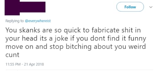 This guy has called women the c-word and the b-word, sent a photo of a crack pipe to a black woman whose views he disagreed with, regularly threatens people on Twitter, and has since blocked me. But apparently he is not abusive and I am thin-skinned.