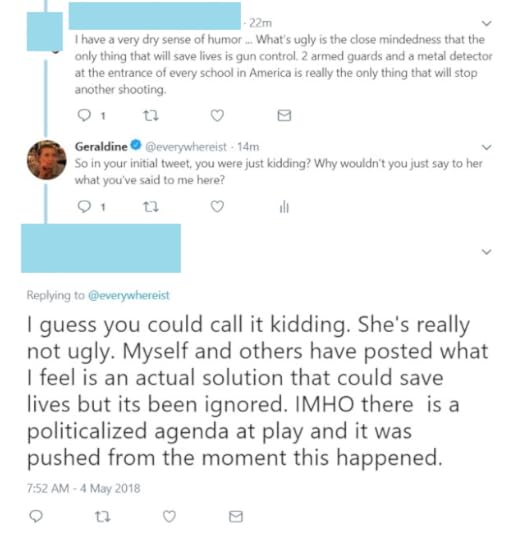 And while we disagree hugely on the gun control issue, I felt like our discussion made him realize that attacking a young woman who’d survived a mass shooting while at school was perhaps not conducive to his goals. I left our exchange feeling a little … optimistic?