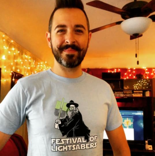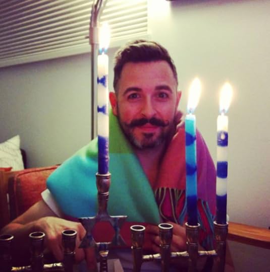 Rand at Hanukkah a few years ago. He’s wearing a blanket draped over his shoulders, but it looks like a multi-color tallit.