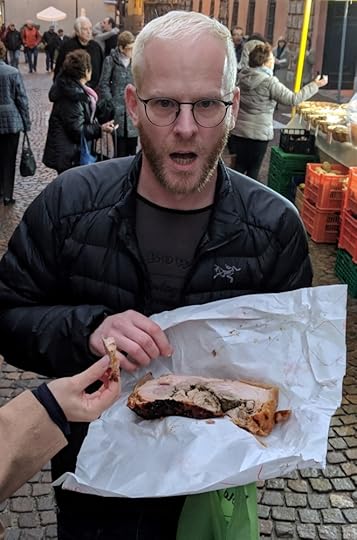 And damn it, Oli is a picky eater. I mean picky. We passed bar after bar, but they only served pasta (which he doesn’t eat because he’s an alien), or no food at all, or weren’t open yet. And then we came across a stall where a man was selling all manner of salumi. A vegeterian nightmare of every sort of cured meat you could imagine. And there, at the center, a roast of pork, a giant thing the size of a not-insubstantial child.