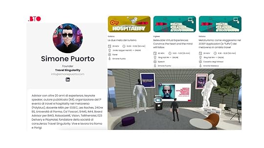 Miei interventi in #BTO202229 Nov, 10:00Emilio Salgari Hall #3Le due meta del turismohttps://my.bto.travel/dettagli/dettagli-evento.php?quale=128&tipo=&idAnagrafica=1066166&ln=11:30Ring Hall #4Metaturismo: come viaggeremo nel 2030? https://my.bto.travel/dettagli/dettagli-evento.php?quale=166&tipo=&idAnagrafica=1066166&ln=30 Nov, 11:00Ring Hall #4Believable Virtual Experienceshttps://my.bto.travel/dettagli/dettagli-evento.php?quale=195&tipo=&idAnagrafica=1066166&ln=