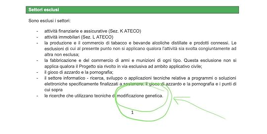 Bando Innovazione Sostantivo Femminile 2022.Tra i settori esclusi ci sono, ovviamente, quelli del tabacco, alcolici, armi, munizioni, gioco d'azzardo e pornografia.Ma l'ultimo punto esclude dal bando "Le ricerche che utilizzano tecniche di modificazione genetica".Perché?
