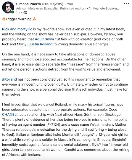 🔥Trigger Warning!🔥What's your perspective on #cancelculture? How should we approach the issues while still holding individuals accountable for their behavior?#rickandmorty #justinroiland @adultswim @RickandMorty @HUGOBOSS @CHANEL https://www.linkedin.com/posts/puortosimone_roiland-activity-7023949011510280192-RoX3