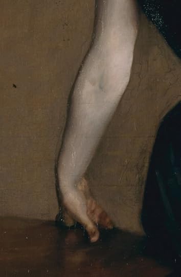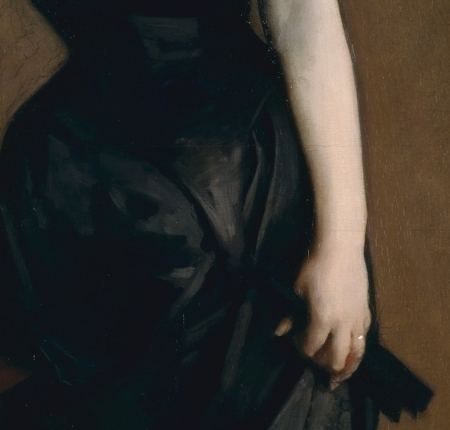 Sargent depicted Gautreau without any jewelry except her tiara and her wedding ring, which gleams gold against the black and ivory. The lack of jewelry was shocking to audiences, since the fashion was to be absolutely dripping with it. The implication is that Gautreau has returned home from an evening out and taken off her jewels. That makes this not a public moment but a private one. Add the slipped strap, and the implication is that Gautreau’s getting ready for some hanky-panky after a night of parties.
