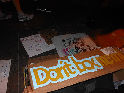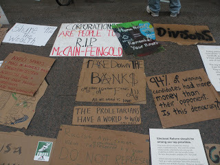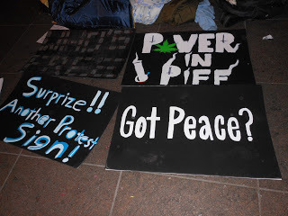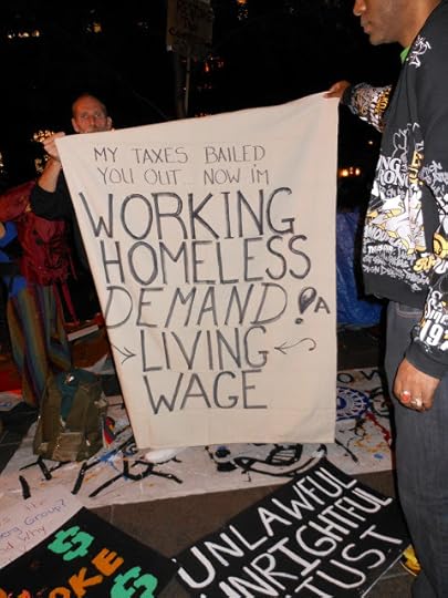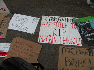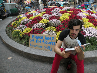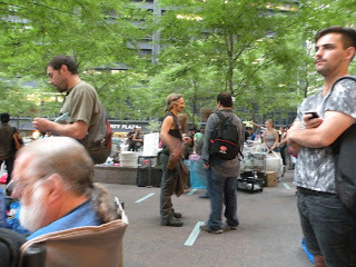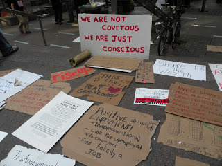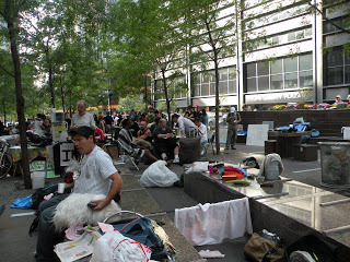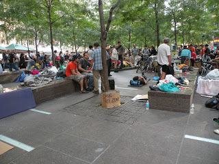The young woman who was dressed in a plain gray skirt and blouse with a jacket looked at me and laughed at my question. "We are demonstrating here," she said. "We're the 99 percent who have nothing because the 1 percent have it all. What better place to protest than here where it starts? I guess though to answer your question, there are many young people who can't get work and since they can't get work they figure they may as well get a head start with claiming a spot since pretty soon there's going to be a lot more of us homeless than before with degrees and all. So many have moved here so they have a place to be."