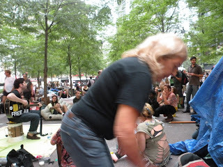 Entering the square I looked around me and it seemed the park had been overtaken by homeless. I found myself standing next to a young lady with blond hair who appeared very business like. I started a conversation. "Are there a lot of homeless people who have moved into this park?" I asked, this only being day two of the occupy movement and not knowing anything.