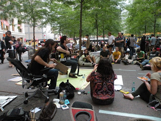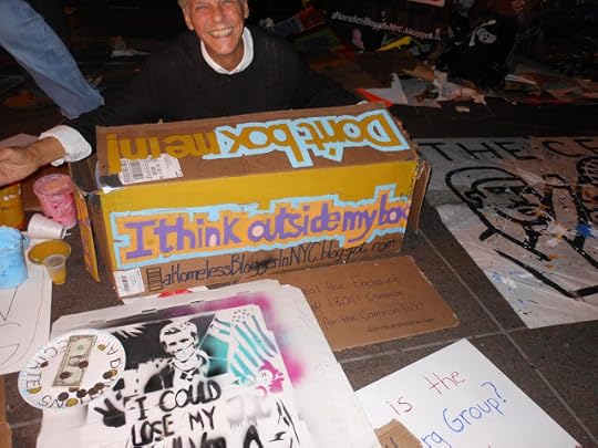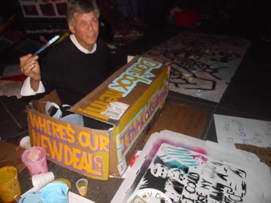 We discussed the possibility of a performance space and I promised to research their cause since I liked what I heard. I hung out for several hours walking around and checking out the boobs which were nice to see and wrote down the website, occupywallstreet.com, intending to google it when I got home. Over the next few days I kept expecting to hear something on the news but it never happened. I decided to revisit and bring my poetry hoping there would be the performance space. And it just so happened that the stage was on when I got there. I signed my name and performed. The audience was great and there was no one drink minimum or entrance fee and they all screamed "encore!" For the first time in years I felt hopeful about our political state of mind. The country has turned into us the worker bees, being peons, and the big folk take everything we earn except leaving us enough to be strong enough to work for them.