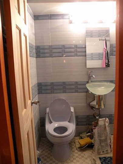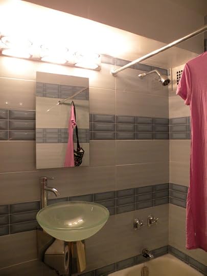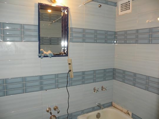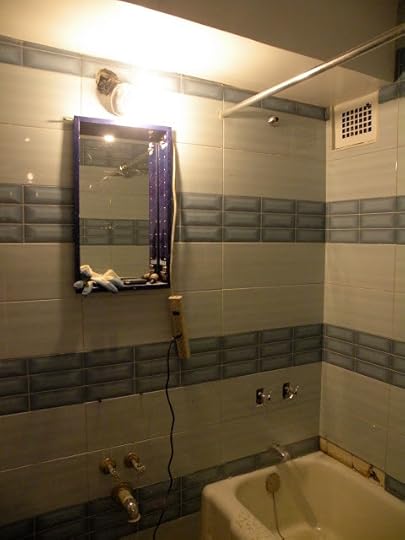 Yesterday and today was the third and fourth day of work and now I have my toilet working and the sink half mounted but not working. The new showerhead is mounted as well but I'm not certain I will like it as much as the water saver interferes with pressure. I still can't find handles that fit tub faucets. This is an older building and we're not allowed to replace the inner part of a faucet because we'd have to be plumbers and break down the wall to get to what we need. The cobalt blue medicine cabinet is mounted too plus a new wood door is mounted.
