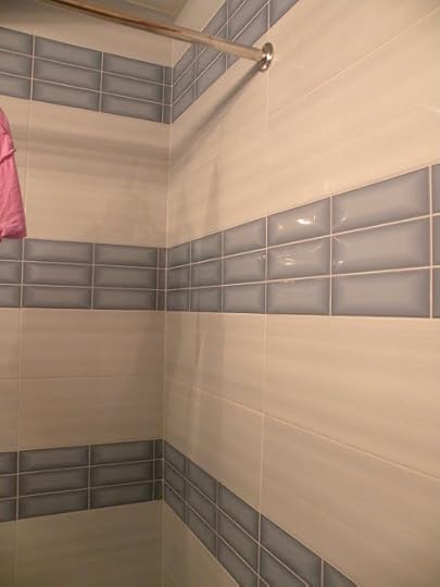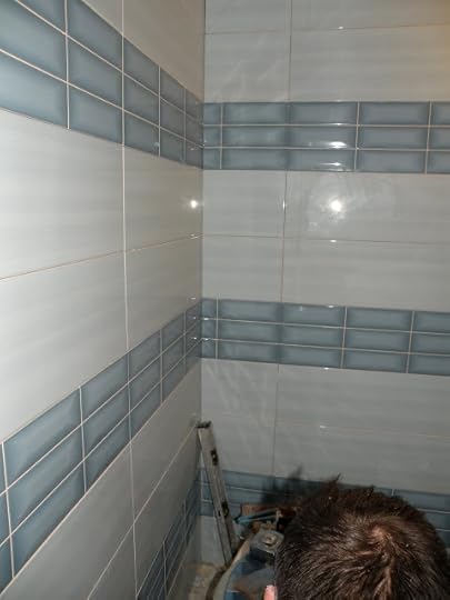 This following four photos represents two full days of work plus a couple of additional hours. Last Friday Harry began breaking down wall tiles and installing the new ones I had bought. By the second day he had completed about eighty percent of the walls. Before this the tiles only went half way up the walls and then the rest of the wall was just regular plastered and painted walls so when he installed floor to ceiling tiles, the ones that began on the wall needed a bunch more of thinset behind them to make the walls even and he had to put a lot of thinset behind the tiles.