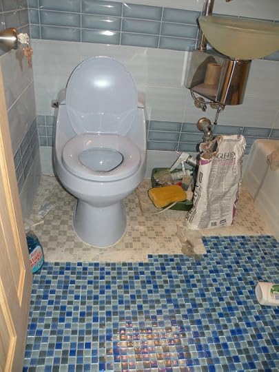 And looky here, half the floor tiles are down in my five by five too. Yippee a new bathroom look is here. What really convinced me was that the wall backing the shower tiled wall was completely rotted out and molded because clean me keeps bleaching away the remnants of sixty year old grout. The floor is already level and the same type of tile is being installed but these are glass tiles. I've seen them in other places for up to thirty dollars apiece but I paid nine bucks at Home Depot. The cobalt blue nutone recessed medicine cabinet is also from home depot. It comes in many colors such as fire red, gold, silver, sunburst orange, and racing green. The toilet is also from Home Depot. The wall tiles can be bought at any specialty tile place