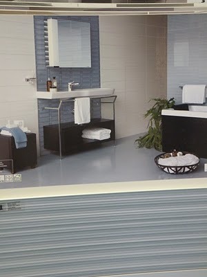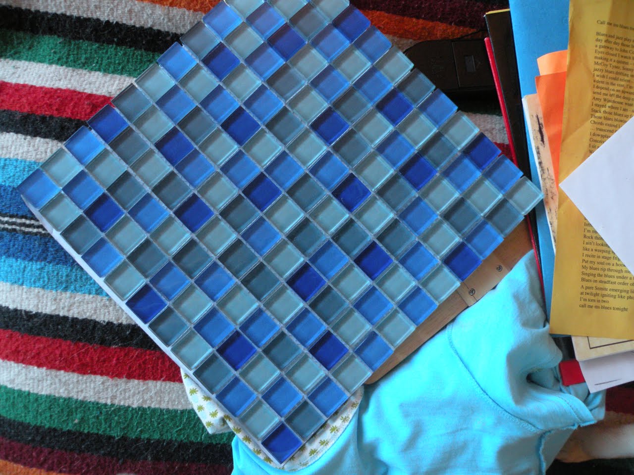 I like this combo, the blue glass floor tiles, they're 12 " X 12 " - each square glass is 1" X 1" and they are mounted on mesh. The box has special installation instructions. I found these at Home Depot for $8.97 apiece. They sure are pretty and this would make a pretty floor. Its name is Blue Lagoon by Daltile.