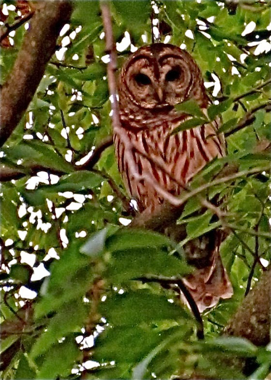 Then, on magnificent wings that were ten times as wide as his body and which seemed to fill my ears with the sound of swooping while being simultaneously stealth, a barred owl sailed from the top of the hickory tree, passing over me. It is disconcerting to see a bird so large flying over because we are not used to it. We're used to songbirds darting about, but this was a very large owl. He (I was unable to discern his gender but he struck me as grandfatherly) perched on a branch of the tulip poplar and considered me from behind a screen of leaves, his eyes as tightly latched to my face as his feet were to that limb. If he blinked I never saw him. Staring contest won, he must have decided I was harmless. He glided back to his original spot near the top of the hickory. And he sat there for the next hour.