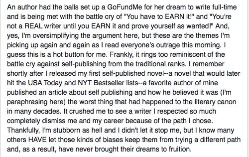 Lexi’s post is in response to the outrage against an author who created a “Gofundme” campaign to help fund her writing. Upon publication, the campaign went viral, many people stating that said author had no right to ask for money while so many other authors were working hard to fund their dream on their own. Lexi had an interesting opinion on the Internet’s adverse reaction to the campaign, one that I’d like to share in its entirety: