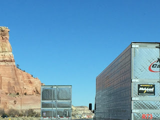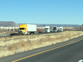 Today we headed through New Mexico after an overnight in Albuquerque. I love the feel and look of New Mexico. What I don't like is the endless stream of semis heading to and from Albuquerque. That aside, the New Mexico landscape is vast, wild and oddly prehistoric. The towering cliffs and red rock, the wind swept plans, all of it seems to hold a story. It's a place, I often think I'd like to stay for awhile, maybe enough time to write a book. We'll see what the future brings.
