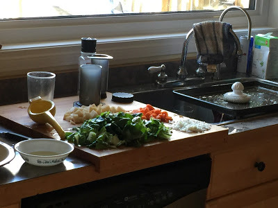 Just part of the cooking sprawl - uglier than urban sprawl.I began what the recipe assured was an "easy" vegetarian supper. I began chopping up a potato and then grabbed the bag of rice. Oops, forgot to soak. Not only that I got a type that required longer than normal soaking. Small oversight - I managed to compensate for that. Rice came out unscathed. But the tofu - don't let anyone tell you that cooking tofu is easy. And if you're one of those that think it is, stop right there. I don't want to hear about it.