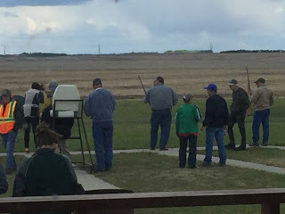 It really wasn't the day for anything outdoors but when things are planned in advance, the weather often doesn't cooperate - at least not on the prairies. We're known for weather that is so unpredictable that often one thinks that the weatherman really just rolled the dice on the last prediction. Today, the wind was crazy strong and there was rain in between. Weather aside, I learned a lot 25 shots later. Like, on my first shot - lean into the gun and you won't plant your foot squarely on the instructor's foot, hard enough to bruise, when the kick throws you backwards. Or, on the second shot, the fact that the empty shells actually spit out with a bit of force when you empty the gun. Again, as I rub my cheek, who knew!
