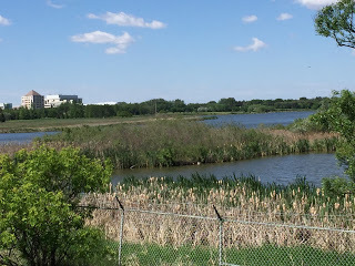 Today, I went for a bike ride along the bike path that winds through city following the path of Wascana Creek. It's rather like being in the country when you're still in the city. The bullrushes crowd along the shore of the creek and birds perch on stalks of plants I can't identify. The sky is that crystal clear blue that prairie skies are known for. I pass a couple of women chatting as they walk their dogs, both of them wearing matching pink harnesses - the dogs that is.