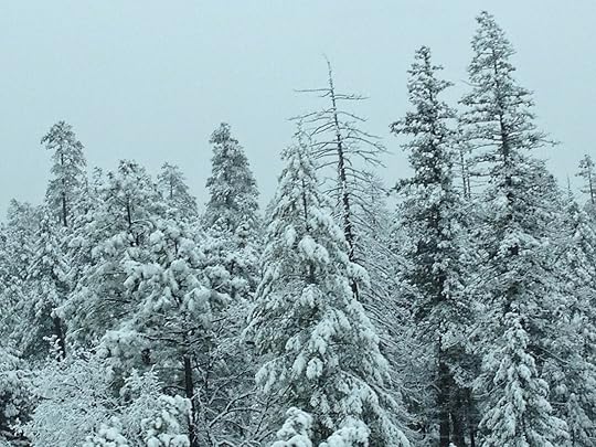 But speaking of motivation, the trip home is very motivating. It has me longing for the warm little cocoon of my basement office where temperatures are steady. And outside they are steady too - below zero and freezing yes but not like the roads on the way home, before we reach the winter hardened ranges and prairie of the last leg of this trek where the snow has more than likely settled for the winter - and that has its own set of issues. But here, as we head out of Arizona and into, and through, New Mexico, temperatures are hovering at a little above zero with rain and then a slide below that zero mark creating in places, treacherous mountain roads. Yes, don't like the drive home much for the fear of what weather might be lurking around the corner. I'm hoping for the upside as that finicky weather man or woman has promised, that the weather for the remainder of the trip might be fine. Or - like today, it might go from sun and flip flops to mountain roads lined with snow laden trees in less than two hours. Yes, that picture was today's view as we left the sun behind. In an odd way, it all reminds me of a romantic suspense. A couple falling in love and then everything turns upside down - sun to snow, for the characters, they are rough, potentially dangerous patches that they must negotiate in order to have their happy ever after.