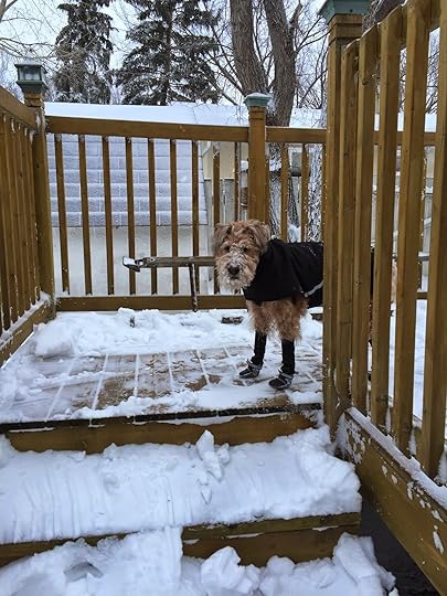 Anyway, here we are the morning after. I'm going for my daily dog walk and the sidewalks are plugged with snow. There are some that have been out early and others that match my schedule and are out blowing snow. And then there's those that just want to sleep in on Sunday or worship or anything but get the snow off the sidewalk. So I do the shuffle walk to clear a primitive path for the dog. And when the drifts get too high, we stop. I know what this means...with a sigh I pick up forty pounds of winter bundled dog and trudge through drifts deep enough to drown my much shorter companion. A man drives by, slows, smiles, waves and carries on. I imagine he thought he might need to be a good samaritan and then realized that we were doing just fine on our own. Or maybe it's not often that you see a dog with boots and coat being carried through snow drifts. But hey, when you've reached the grand old age of fourteen you deserve, occasionally, to get the royal treatment.