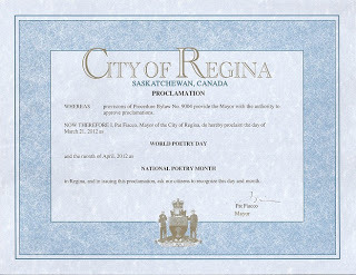 So that was today's walk. No one got whacked. Rourke didn't pay attention. But I, emerged from fantasy land to discover that this month is poetry month. It's time to revisit some of those great works, find some recent poetry, and yes, even try writing some poetry of your own. In Regina, it's even been proclaimed. Don't ask - I can only report the facts. So head out and enjoy a good poem. Not sure where to start - take a peek here.So if you picked a poem to read this month what would it be? Me - I'm thinking of picking a new poet or two from the many that the Saskatchewan Writers Guild has to offer. I'll let you know how that turns out.