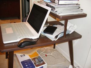 Temporary - repeat - temporary officeApparently not. Even with my office reduced to an old style end table that is three steps from the dust bin and is barely wider than my laptop when the kitchen table is in use - I write. Yes, the life of the displaced and apparently insanely determined writer. Currently, I'm sitting on the floor with my feet tucked under me - guaranteed to cause circulation stoppage at some point. A little pile of research books are teetering on the upper shelf of the retro piece of furniture that's now my desk. I really should do something about them before they topple.